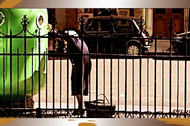 Ilustrasi 6. Cuplikan adegan seorang nenek tua yang membuang sebuah botol pada tong sampah. Sumber: Three Colors Blue