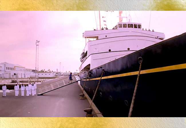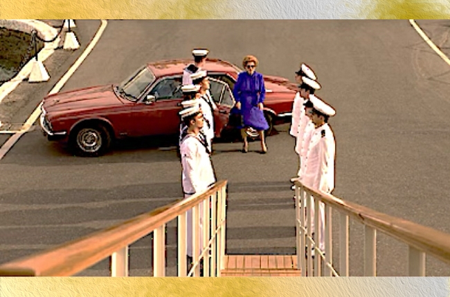 Ilustrasi 2. Long shot, Margaret Tatcher menaiki tangga kapal Her Majesty Yacht Britania, untuk menemui Ratu Elizabeth II, dalam episode “48:1” serial The Crown, Netflix, season 4, episode 8, 2020.