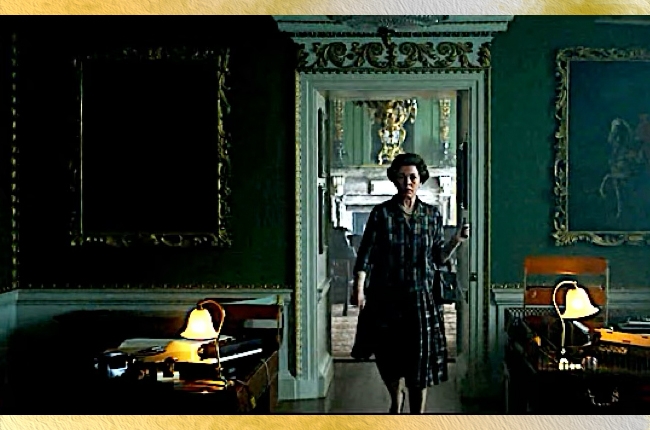 Ketika Margaret Thatcher hadir, kamera mulai memandang adegan tersebut dari sudut yang lebih tinggi (high angle). Sudut ini menggeser relasi kekuasaan di dalam frame. Elizabeth tidak lagi menjadi pusat dominasi visual, melainkan subjek yang sedang ditekan oleh situasi yang ia sendiri sulit kendalikan.