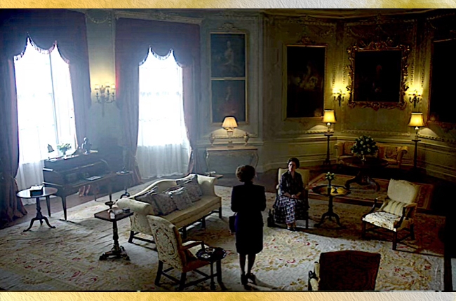 Pertemuan antara Margaret Thatcher dan Ratu Elizabeth II selanjutnya berlangsung di Queen’s Sitting Room. Sebuah ruang privat yang anggun dan feminin. Palet warna cerah, bantal pastel, dan pencahayaan alami membentuk suasana tenang nan berwibawa. Tata ruang simetris menambah kesan formal sekaligus intim. Namun, di balik keanggunan dan nuansa feminin ruangan itu, tersimpan ketegangan visi politik luar negeri yang membara. Thatcher tampil kaku dan konservatif, menjunjung relasi strategis dengan Afrika Selatan, sementara Elizabeth mengedepankan nilai moral dan sikap tegas terhadap apartheid.
