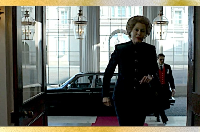 Thatcher menaiki tangga kapal. Posisi kamera merekam dari atas (high angle). Secara visual menyiratkan ia memasuki domain monarki. Kamera berpindah ke bawah. Dengan long shot, tubuh Thatcher tampak kecil dalam ruang luas. Namun, determinasi dan keteguhan “Wanita Besi” nampak dari gerak diagonal yang tegas, tak tergoyahkan.