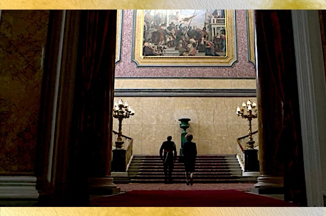 Pada momen menjelang pertemuan antara Margaret Thatcher dan Ratu Elizabeth II di Istana Buckingham, kamera bergerak dinamis menelusuri ruang demi ruang, seolah menuju pusat konflik. Sejak mobil Thatcher melaju melewati gerbang istana hingga ia menapaki lorong-lorong megah, pergerakan kamera terus mengikuti—dari belakang (follow track), depan (track back), hingga samping (side track)—mengiringi setiap langkahnya. Gerakan ini bukan sekadar mengikuti aksi, tetapi juga menggemakan tekad dan emosi yang bergolak.