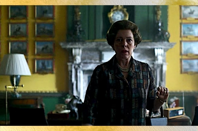 Sebaliknya, dalam adegan yang sama, Thatcher kerap diperlakukan kamera dengan sudut yang lebih netral atau bahkan sedikit rendah. Perbedaan sudut ini menciptakan ketegangan yang tidak diucapkan: secara struktural Elizabeth adalah kepala negara, tetapi secara visual ia ditempatkan di bawah tekanan yang tidak dapat ia abaikan.