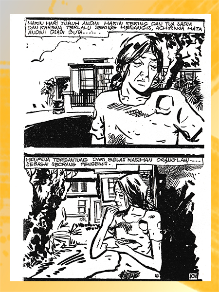 Pada panil pertama, kemandulan sudah menjadi kondisi tetap, disampaikan melalui balon cakapan dalam sel penjara, oleh perempuan narapidana pembunuh yang sedang menyulam/membordir; panil kedua masih sebagai harapan dalam balon cakapan di atas ranjang; panil ketiga juga harapan, tapi dalam balon renungan di lokasi perumahan yang tampak nyaman—dengan seorang perempuan mendorong kereta.