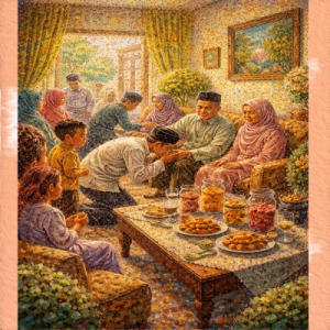 Namun, dalam pengalaman Indonesia, arah itu hampir selalu menemukan panggungnya: ruang tamu. Sebuah ruang yang tampak sederhana, tetapi sesungguhnya menyimpan satu orkestrasi yang utuh—di mana segala yang tersaji, dari kue hingga kursi, bukan sekadar dekorasi, melainkan properti dari satu repertoar utama: ritual pemohonan maaf, saling memaafkan, dan harapan kembali pada kesucian kemanusiaan.