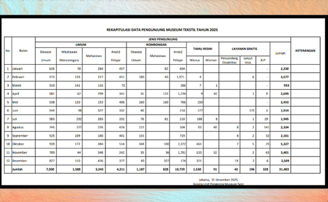Museum Tekstil Jakarta beroperasi dalam kerangka kebijakan negara sebagai bagian dari sistem pengelolaan kebudayaan di DKI Jakarta. Status bangunan cagar budaya memberikan perlindungan hukum terhadap keberadaan fisik dan koleksi. Struktur kelembagaan menempatkan museum dalam sistem birokrasi yang terstruktur. Sistem ini memastikan keberlanjutan pelestarian dalam jangka panjang. Data kunjungan tahun 2025 mencatat 31.489 pengunjung dengan fluktuasi yang signifikan sepanjang tahun. Bulan Oktober menunjukan angka tertinggi, sementara Maret berada pada titik terendah. Komposisi pengunjung mencerminkan keterbukaan akses bagi berbagai kelompok masyarakat. Layanan edukatif seperti membatik serta tiket yang terjangkau memperkuat fungsi publik museum. Data ini menunjukan museum sebagai institusi sosial yang aktif.