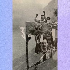 Foto karya Oscar Motuloh, “Depan Rumah Om Lim, Jalan Angkasa, Jakarta, 14 Mei 1998, pukul 13.18 wib”. Menggambarkan ingatan pembakaran lukisan konglomerat Lim Sioe Liong dan isteri, karya seniman Li Shuji. (Sumber: Dokumen.)