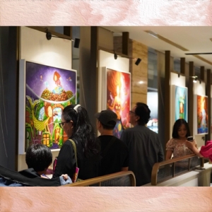 Figure 5. Suasana pembukaan pameran, karya Lully yang terpajang di ruang makan atau restoran Gramm hotel. (dokumen Dicti Art laboratory)