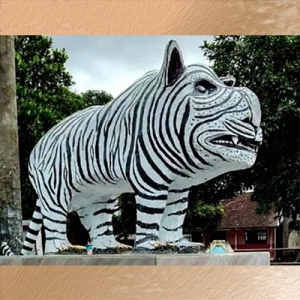 Yang pertama adalah satwa macan atau harimau, lewat patung “Monumen Macan Putih Kediri” yang didirikan di Dusun Balongjeruk, Kediri. Meski naik panggungnya patung macan ini bukan karena kualitas estetiknya, dan bukan lantaran aspek monumentalitasnya. Tetapi karena berbagai unsur “kesalahan” yang disebabkan oleh kenaifan pematungnya. Sehingga si macan lantas hadir menjadi satwa hibrid yang tiada berasal-usul. Raut mukanya seperti tapir, gemuknya mirip babi hutan, belangnya mirip kuda zebra, kekarnya seperti badak, karakter imutnya mirip tupai, postur tubuhnya buntet mendekati tikus.