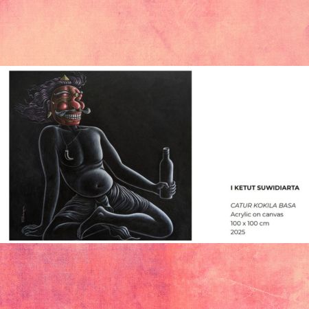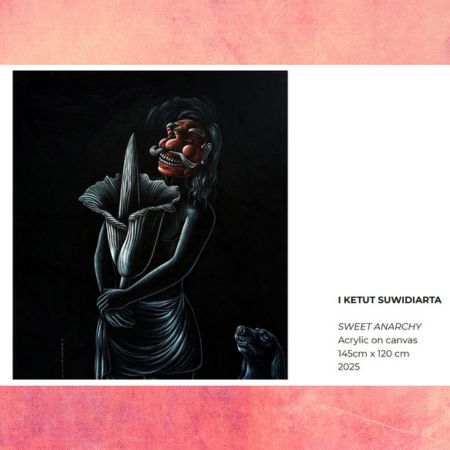Ketut Suwidiarta, nama pelukis itu, menampilkan tiga lukisan yang semuanya berupa dominasi warna hitam, sosok yang sama: bagian kepala berupa idiom budaya tradisional Bali, berupa barong landung dengan seringai, bagian tubuhnya digambar secara realis sososk tubuh manusia. Dalam perspektif yang dikemukakan sang kurator, sosok kepala adalah ‘kelahiran pertama’ dan sosok tubuh yang utuh tanpa luka adalah ‘kelahiran kedua’, yaitu kelahiran promethean yang rasa perihnya diekspresikan dengan seringai.