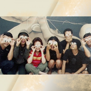 Melani, nomer tiga dari kiri, bersama I Made Widya Diputra ‘Lampung’, David Azmi Putra, Kusmanto, I Gusti Ngurah Udiantara ‘Tantin’, Bayu Yuliansyah, dan Samsul Arifin, di Yogyakarta 2009. (Sumber: Indonesia Art World)