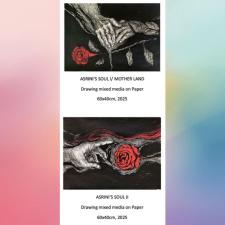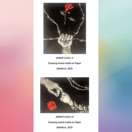 Gambar-gambar yang dibuat Bambang Asrini Widjanarko – semua menampilkan idiom tangan – baik telapak tangan, maupun punggung tangan, nantinya akan dipamerkan di Galeri Darmin, Jakarta pada 21 Desember mendatang. Menarik jika kita melihat yang disodorkan Bambang, adalah tangan tua – tangan yang sudah keriput. Tangan uzur. Semua gambar Bambang berkaitan dengan tangan yang sudah renta beserta imajinya. Bambang mengakui ide utama menggambar tangan keriput ini, dari tangan sang almarhum ibunda. Sehari-hari saat sang ibu masih hidup, Bambang dan ibunya tinggal berdua di sebuah rumah kontrakan. Dia merawat ibunya. Dia tahu betul fisik ringkih ibunya. Kecemasan-kecemasan, kekhawatiran-kekhawatiran dan doa-doa ibunya.